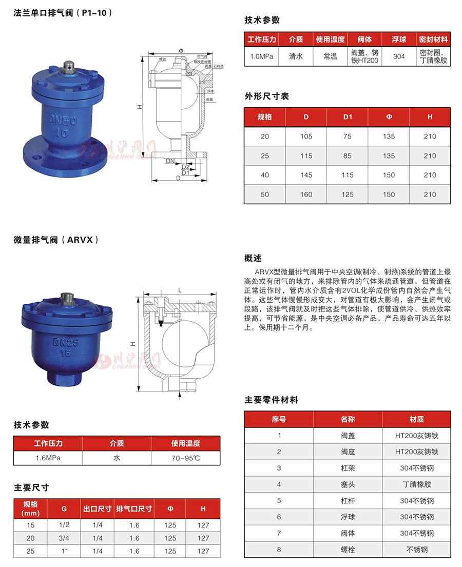 ARVX型微量排气阀用于中央空调(制冷、制热)系统的管道上高处或有闭气的地方,来排除管内的气体来疏通管道,但管道在正常运作时,管内水介质含有2VOL化学成份管内自然会产生气体。这些气体慢慢形成变大,对管道有极大影响,会产生闭气或段路,该排气阀就及时把这些气体排除,使管道供冷、供热效率提高,可节省能源,是中央空调必备产品,产品寿命可达五年以上。保用期十二个月。