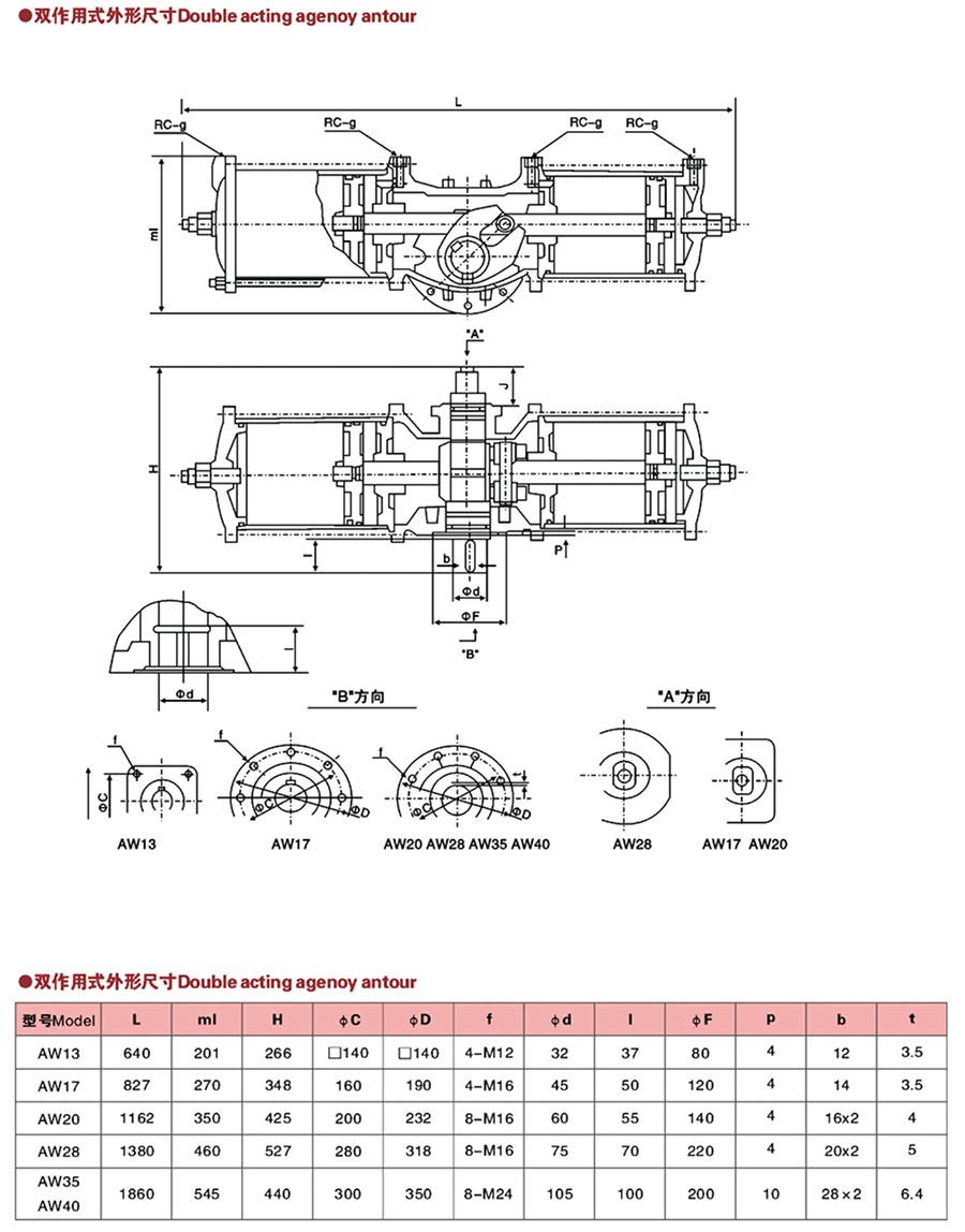 AW气动执行器分为双作用式和单作用式(弹簧复位),两个分体气缸,双活塞,拔叉式传动结构,容易制造大尺寸缸体,输出扭矩大,动作灵活平稳;气缸体内壁和活塞轴镀硬铬,有很好的抗磨性;所有滑动部件之间配有无润滑轴承和导向环以降低摩擦系数,延长使用寿命。AW气动执行器的U型曲线特性输出扭矩更适用于大口径球阀、蝶阀的开关和调节,也可用于其他90回转场合。