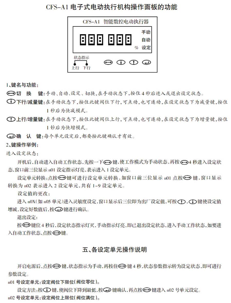 2、执行器的上下限位,行程零位,满量程均可在执行器操作面板上设定。