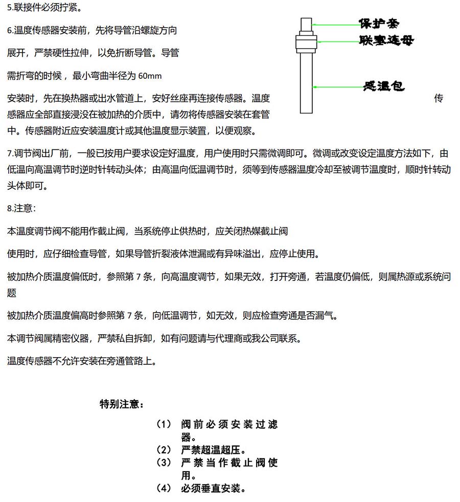 ZZWP自力式温度调节阀,由控制阀门和温控器组成。按用途分为加热型和冷却型。适用于非腐蚀性的液体、气体和蒸汽,在各种冷却系统中的温度控制。当被控介质温度升高,控制阀门关闭(加热型);当被控介质温度升高,控制阀门开启(冷却型)。主要特点:1、无需外界能源,有效节约能源;2、控制精度高,工作稳定,安全可靠;3、感温液体膨胀均匀,比例式调节控制;4、温度设定操作简单,调节方便;5、体积小、重量轻,安装方便。